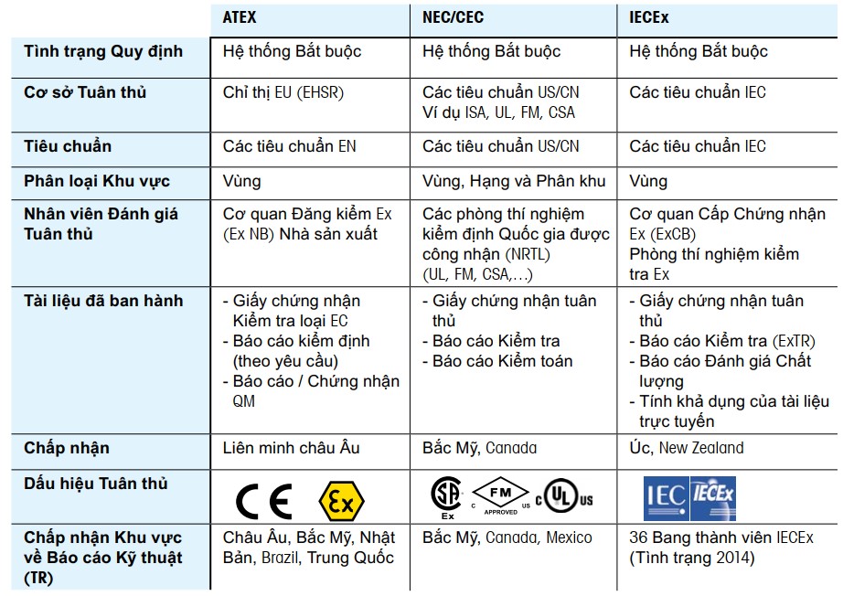 Bảng so sánh Chỉ dẫn ATEX NEC/CEC và IECEX