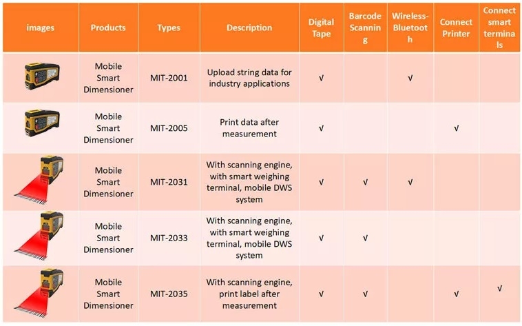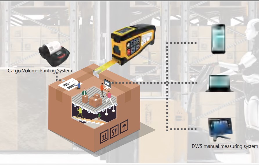 Thước đo kích thước hàng hóa và đồ vật một cách nhanh chóng bằng dây hoặc tia laser. Tự động tính thể tích hoặc tính toán theo các phép tính định sẵn. Tích hợp với chức năng quét mã vạch, và truyền dữ liệu về máy PDA, điện thoại Smart Phone, hoặc máy tính, v.vv qua BlueTooth.